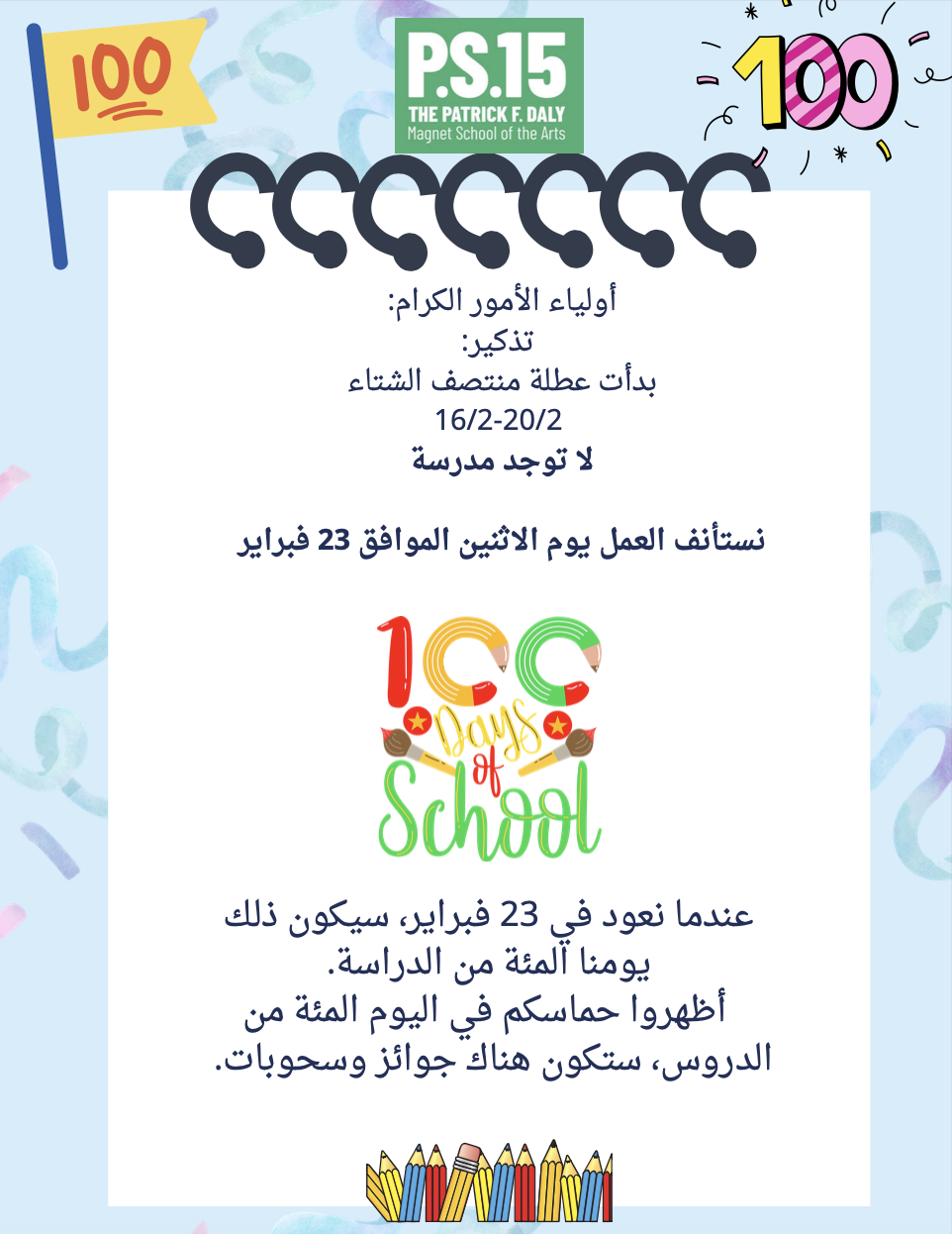 نعود يوم الاثنين 23 فبراير — وسيكون اليوم الـ100 من المدرسة!