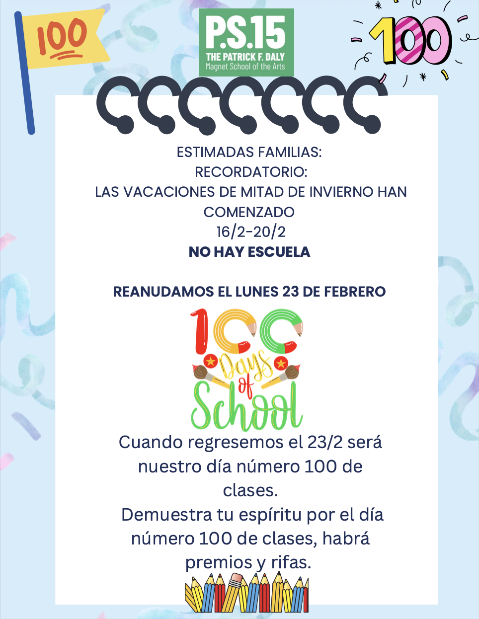 Regresamos el lunes 23 de febrero — ¡y será nuestro Día 100 de Escuela!