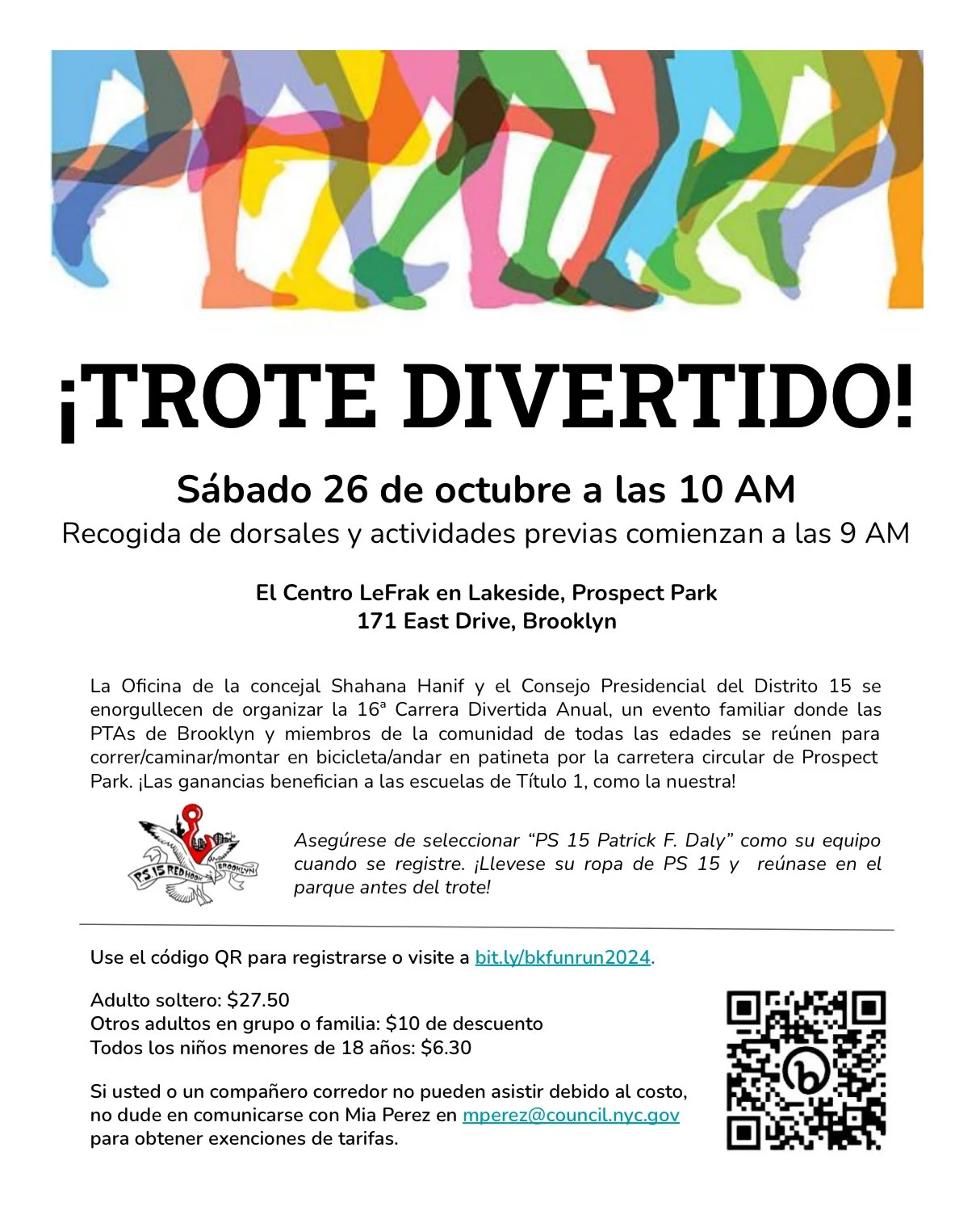 La Oficina de la concejal Shahana Hanif y el Consejo Presidencial del 15 se enorgullecen de organizar la 16ª Carrera Divertida Anual, un evento familiar donde las PTAs de Brooklyn y miembros de la comunidad de todas las edades se reúnen para correr/caminar/montar en bicicleta/andar en patineta por la carretera circular de Prospect Park. ¡Las ganancias benefician a las escuelas de Título 1, como la nuestra!