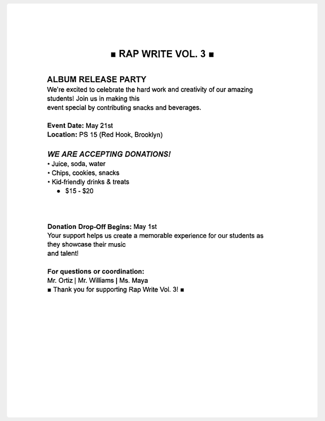 Donations welcome: juice, water, snacks & kid-friendly treats