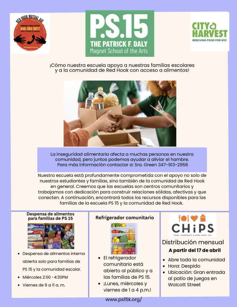 Nuestra comunidad de PS 15 continúa apoyando a nuestras familias y vecinos de Red Hook con acceso a alimentos y recursos.