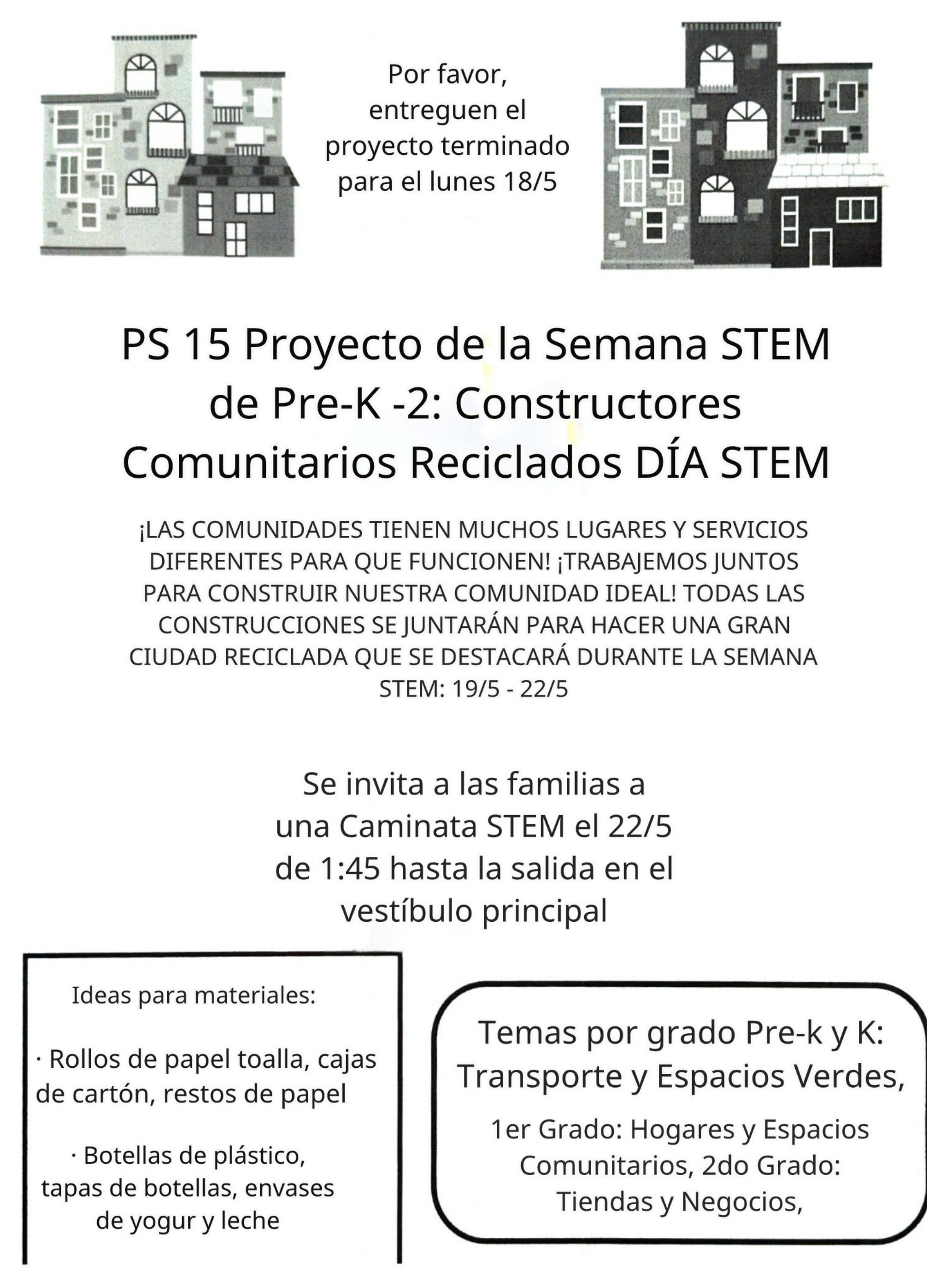 ¡Los estudiantes de Pre-K a 2º grado de PS 15 se están preparando para nuestro proyecto Constructores de Comunidad Reciclada! No olviden comenzar a crear el edificio de su hijo/a usando materiales reciclados de casa.