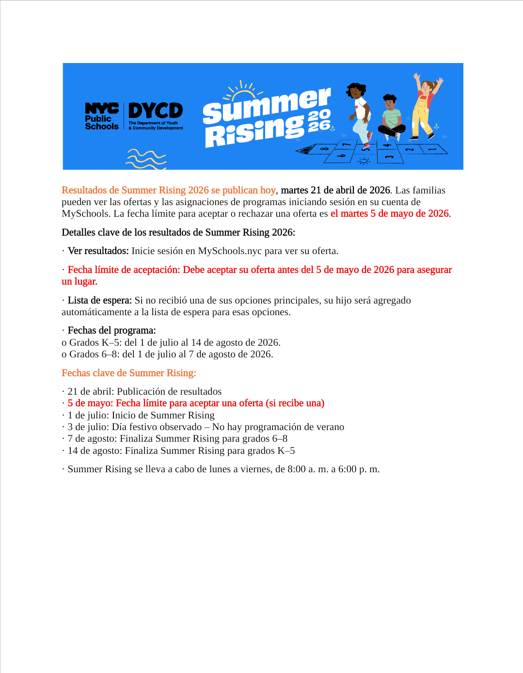 Las familias pueden iniciar sesión en MySchools para ver la asignación de programas. Asegúrese de aceptar su oferta antes del 5 de mayo para asegurar el cupo de su hijo/a.